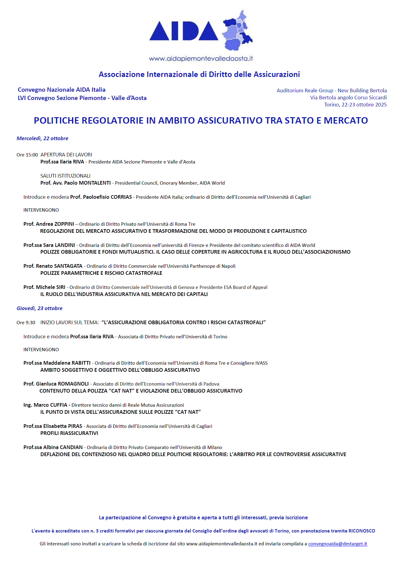 L’evento è accreditato con n. 3 crediti formativi per ciascuna giornata dal Consiglio dell'ordine degli avvocati di Torino, con prenotazione tramite RICONOSCO e l’invio della scheda di iscrizione